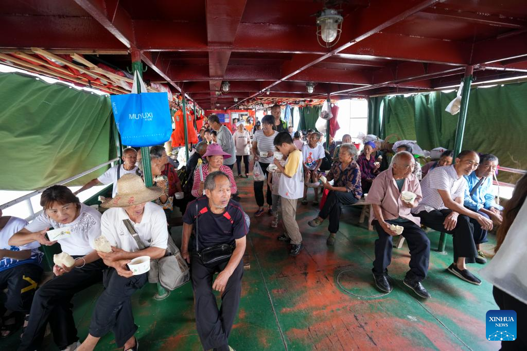 Senior passengers have free breakfast on "Yu Zhong Ke 2180" ferry in southwest China's Chongqing Municipality, July 10, 2024.