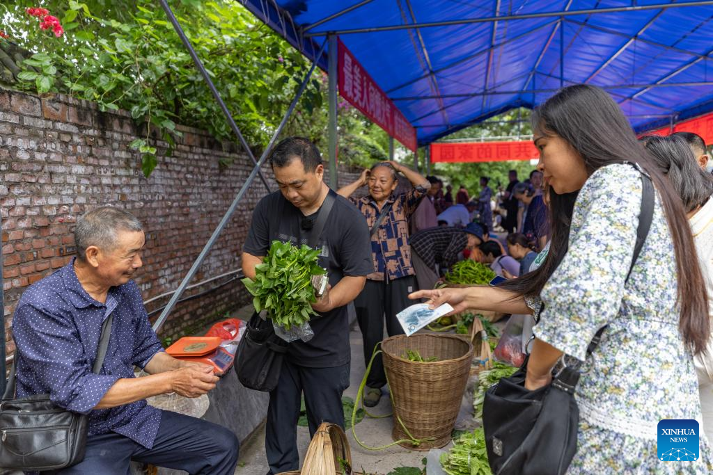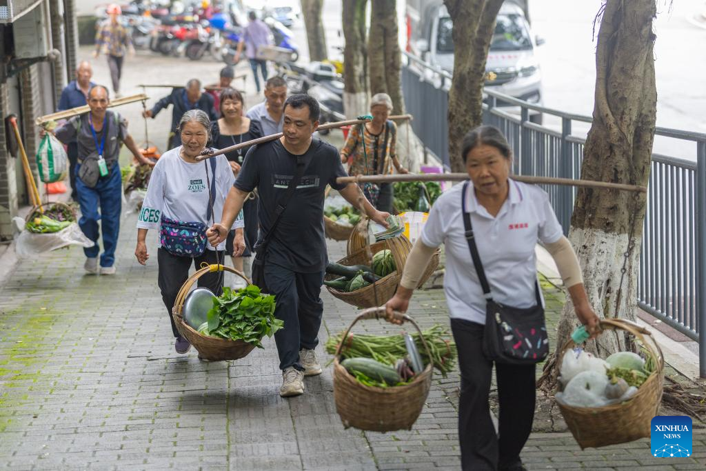 Qin Dayi (C) helps a senior farmer carry farm produce to a temporary market in Zhongxian County, southwest China's Chongqing Municipality, July 10, 2024.