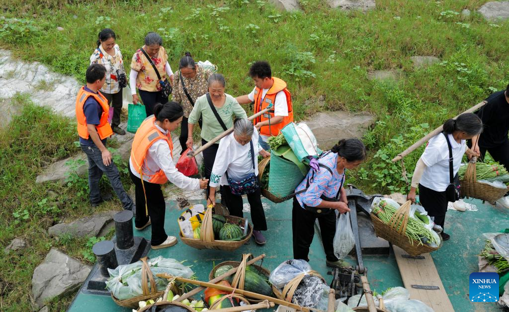 Qin Dayi (3rd R) and Qin Yuanze (2nd R) help senior farmers carry their produce in Xishan Wharf in Zhongxian County, southwest China's Chongqing Municipality, July 11, 2024.