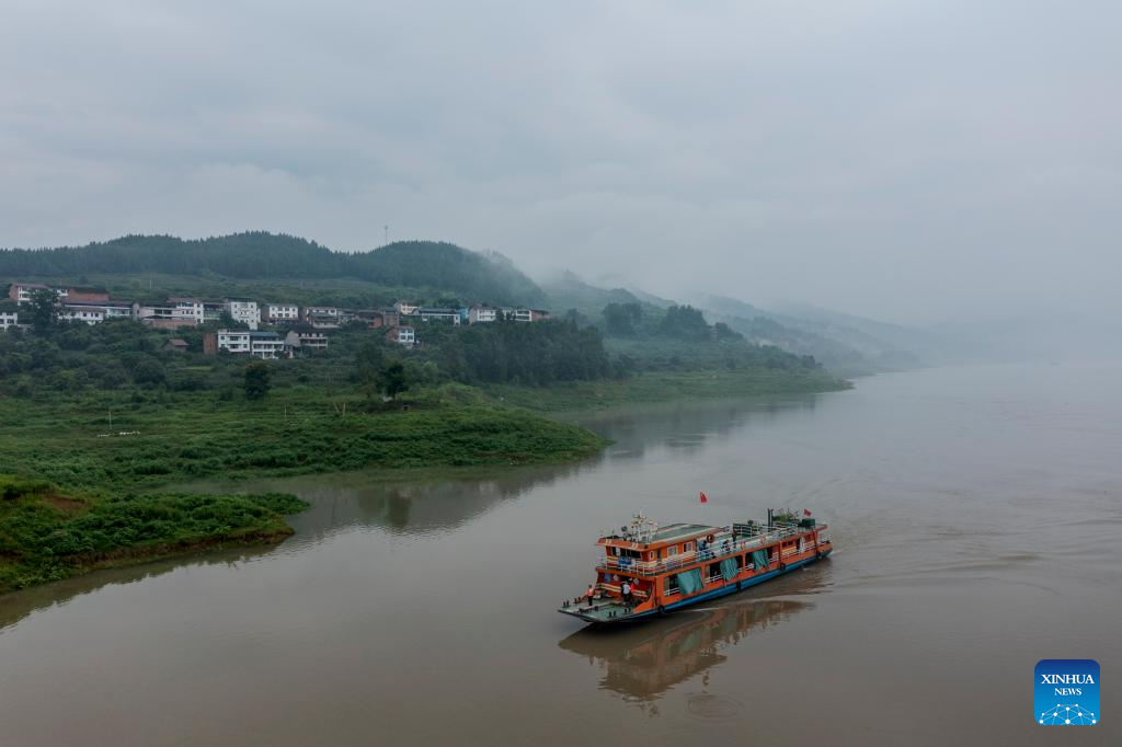 An aerial drone photo taken on July 10, 2024 shows "Yu Zhong Ke 2180" ferry sailing in Zhongxian section of the Yangtze River in southwest China's Chongqing Municipality.