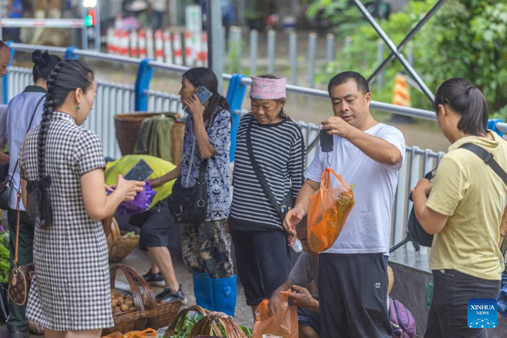 Qin Dayi (2nd R) helps farmers sell their produce at a temporary market in Xishan Wharf in Zhongxian County, southwest China's Chongqing Municipality, July 11, 2024.