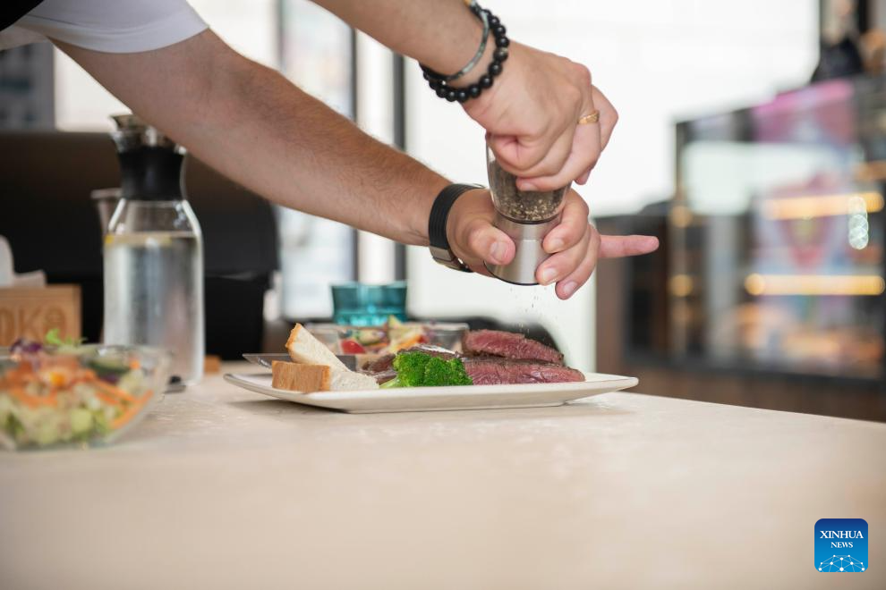Gabriel Martin seasons the steak at LOKO steakhouse in the ancient city of Wuhu in Wuhu City, east China's Anhui Province, June 20, 2024.(Xinhua/Fu Tian)