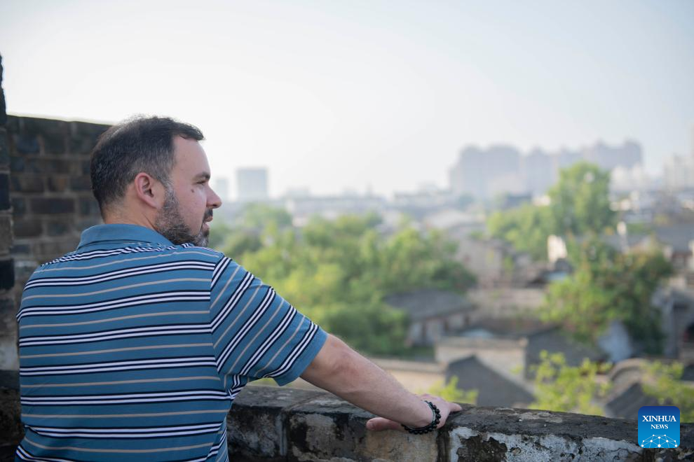 Gabriel Martin views the scenery in the ancient city of Wuhu in Wuhu City, east China's Anhui Province, June 20, 2024.