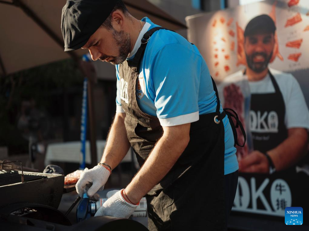 Gabriel Martin cooks steaks during a beer festival in the ancient city of Wuhu in Wuhu City, east China's Anhui Province, July 19, 2024.(Photo by Miao Yuchen/Xinhua)
