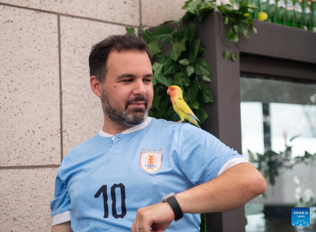 Gabriel Martin interacts with his pet bird in the ancient city of Wuhu in Wuhu City, east China's Anhui Province, July 19, 2024.(Xinhua/Fu Tian)