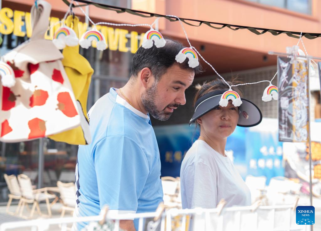 Gabriel Martin (1st R) and his Chilean friend Paul (2nd R) interact with customers during a beer festival in the ancient city of Wuhu in Wuhu City, east China's Anhui Province, July 19, 2024.(Xinhua/Fu Tian)