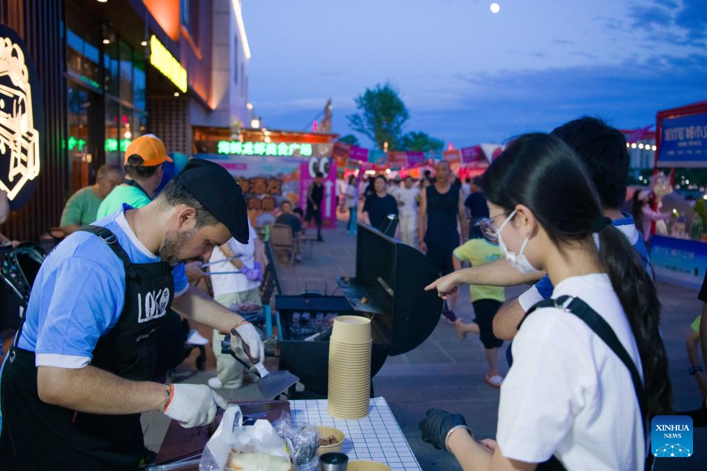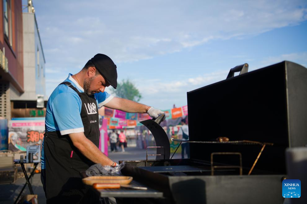 Gabriel Martin (1st L) cooks steaks during a beer festival in the ancient city of Wuhu in Wuhu City, east China's Anhui Province, July 19, 2024. (Xinhua/Zhang Duan)