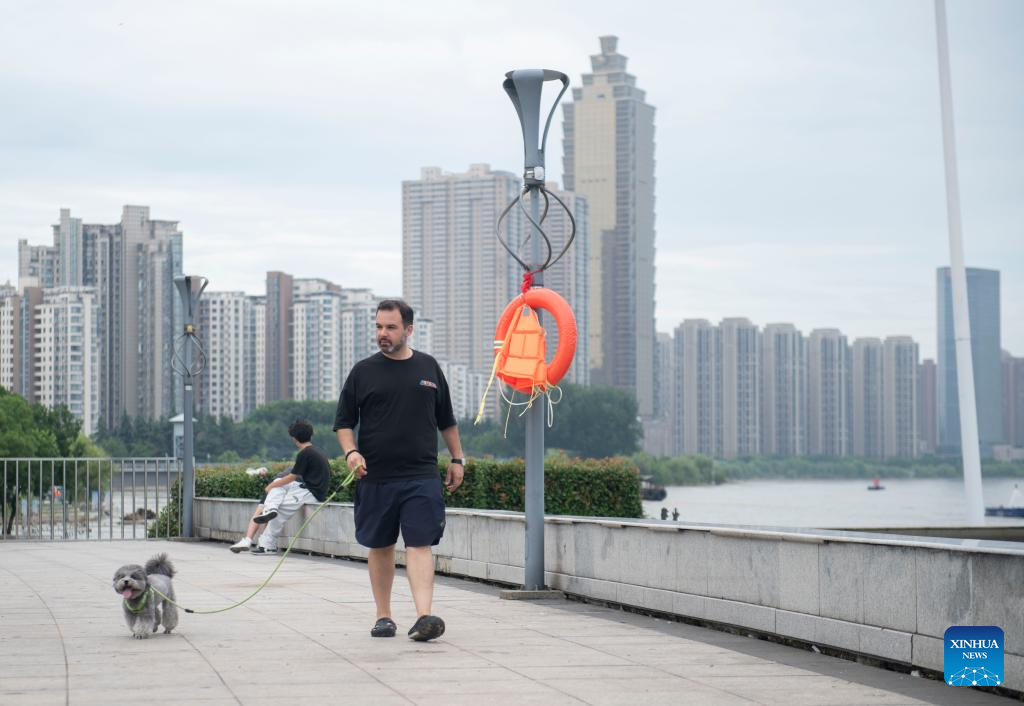 Gabriel Martin walks his dog along the Yangtze River in Wuhu City, east China's Anhui Province, July 20, 2024.(Xinhua/Fu Tian)