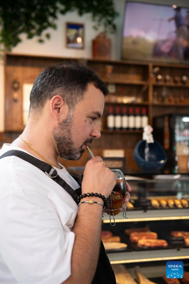 Gabriel Martin displays a tea set he brought from Uruguay for Mate tea at LOKO steakhouse in the ancient city of Wuhu in Wuhu City, east China's Anhui Province, June 20, 2024.(Xinhua/Fu Tian)