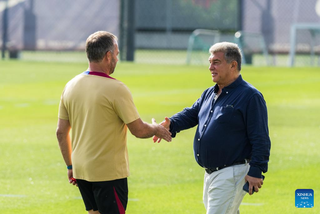 FC Barcelona's head coach Hansi Flick (L) shakes hands with Joan Laporta, President of FC Barcelona, during a training session at the Joan Gamper training ground, near Barcelona, Spain, on July 19, 2024. (Photo by Joan Gosa/Xinhua)