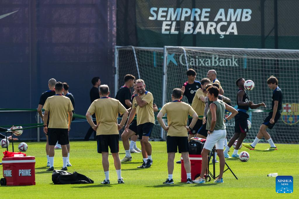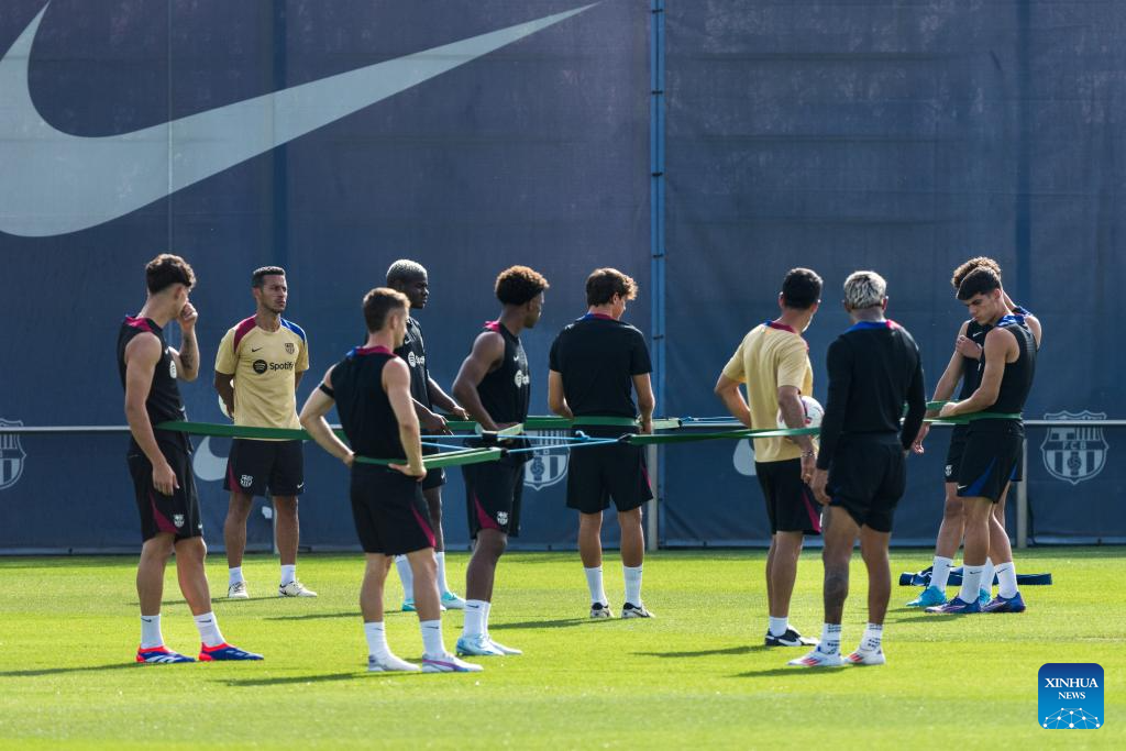 Players of FC Barcelona attend a training session at the Joan Gamper training ground, near Barcelona, Spain, on July 19, 2024. (Photo by Joan Gosa/Xinhua)