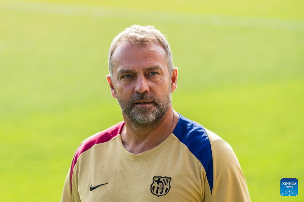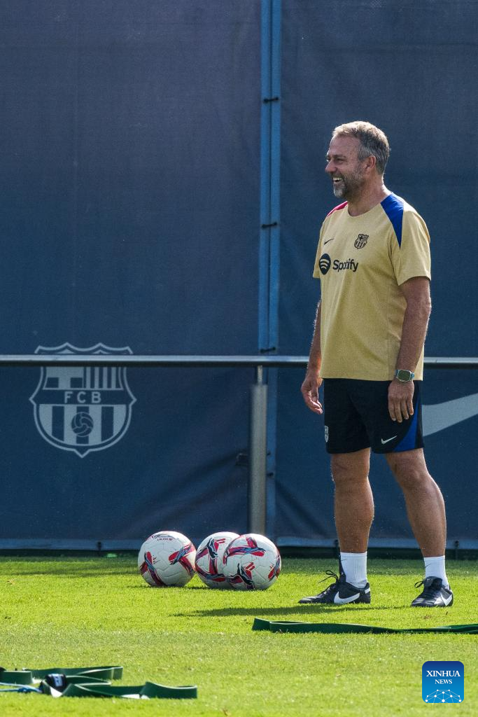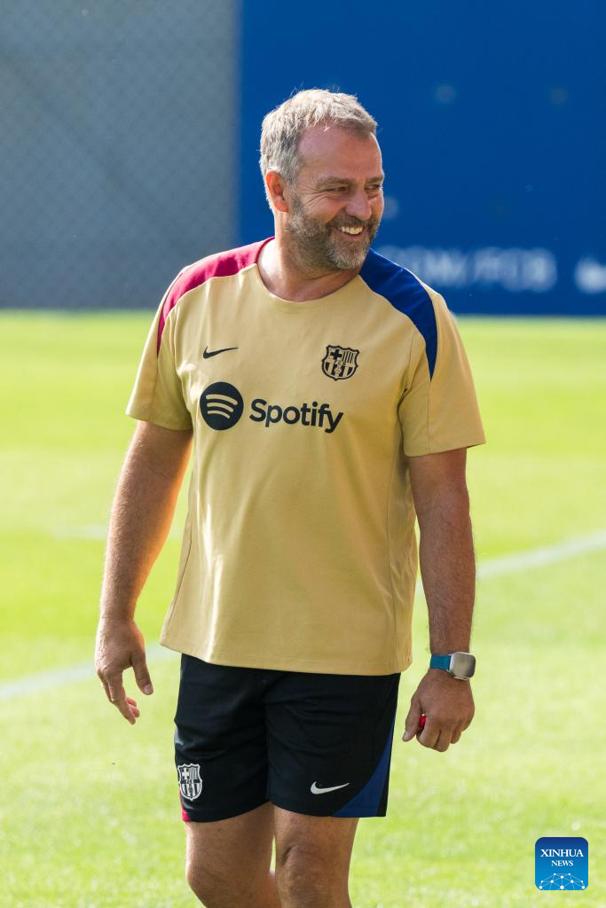 FC Barcelona's head coach Hansi Flick attends a training session at the Joan Gamper training ground, near Barcelona, Spain, on July 19, 2024. (Photo by Joan Gosa/Xinhua)