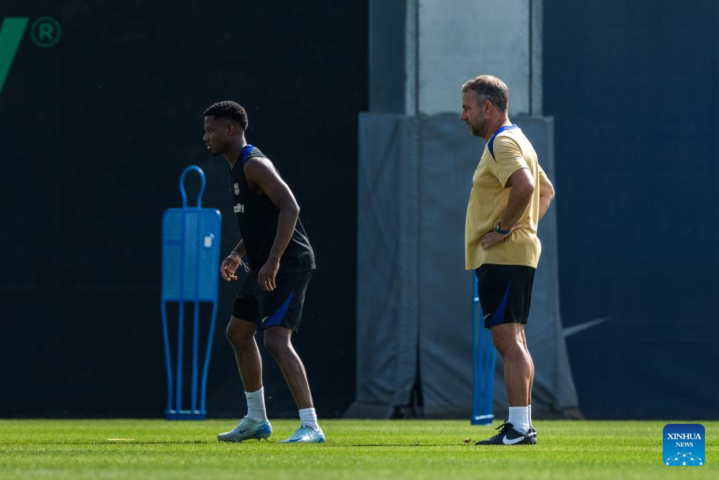FC Barcelona's head coach Hansi Flick and player Ansu Fati (L) attend a training session at the Joan Gamper training ground, near Barcelona, Spain, on July 19, 2024. (Photo by Joan Gosa/Xinhua)