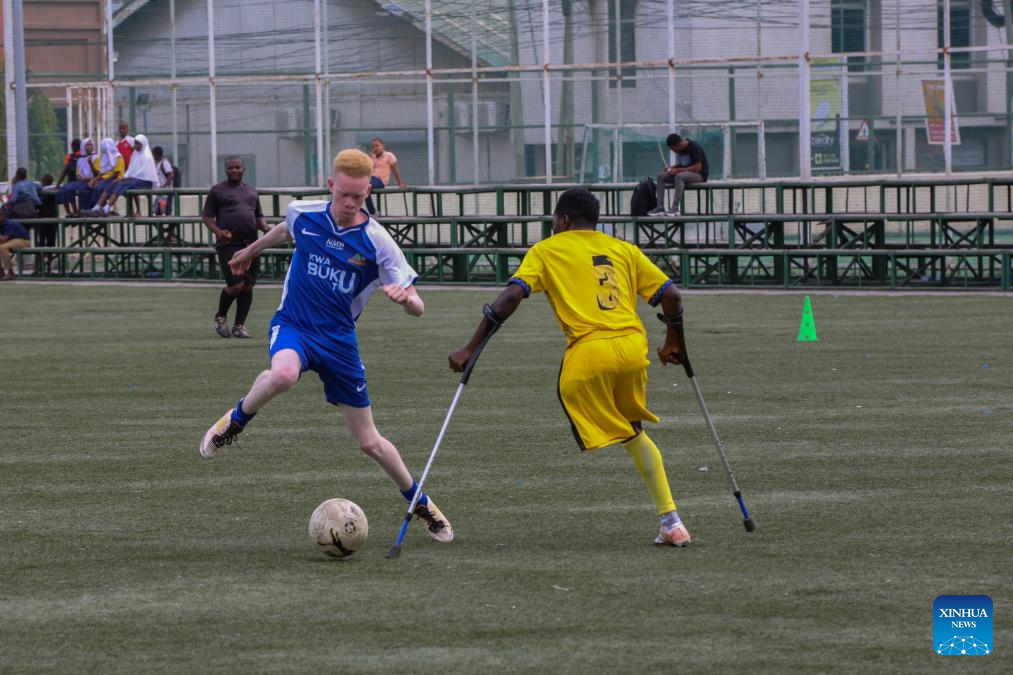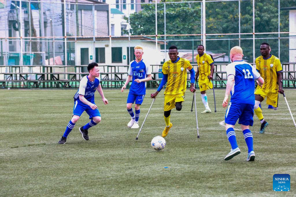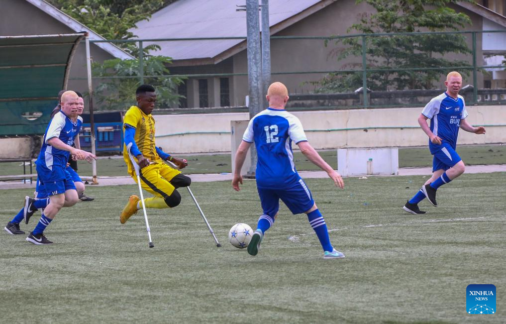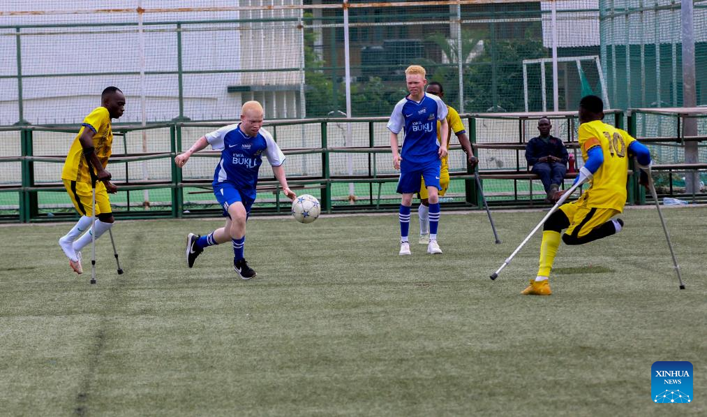 Players of Albinism Sports Club compete with players of Sauti Parasports Club during a friendly match at the Jakaya M. Kikwete Youth Park in Dar es Salaam, Tanzania, on July 20, 2024. (Photo by Emmanuel Herman/Xinhua)