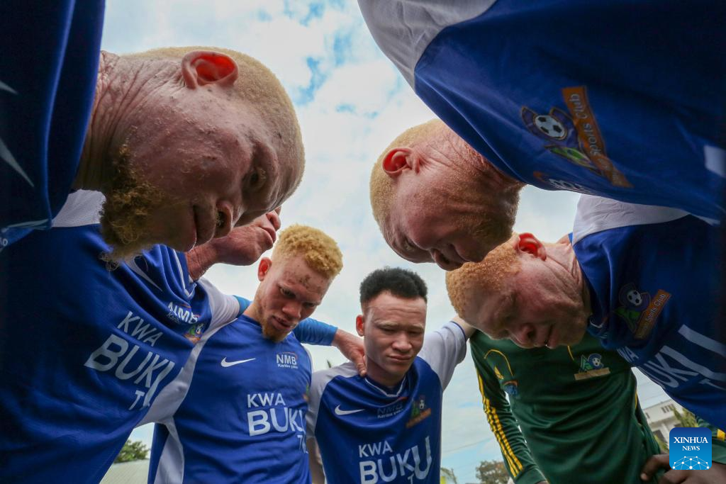 Players of Albinism Sports Club gather together before a friendly match at the Jakaya M. Kikwete Youth Park in Dar es Salaam, Tanzania, on July 20, 2024. (Photo by Emmanuel Herman/Xinhua)