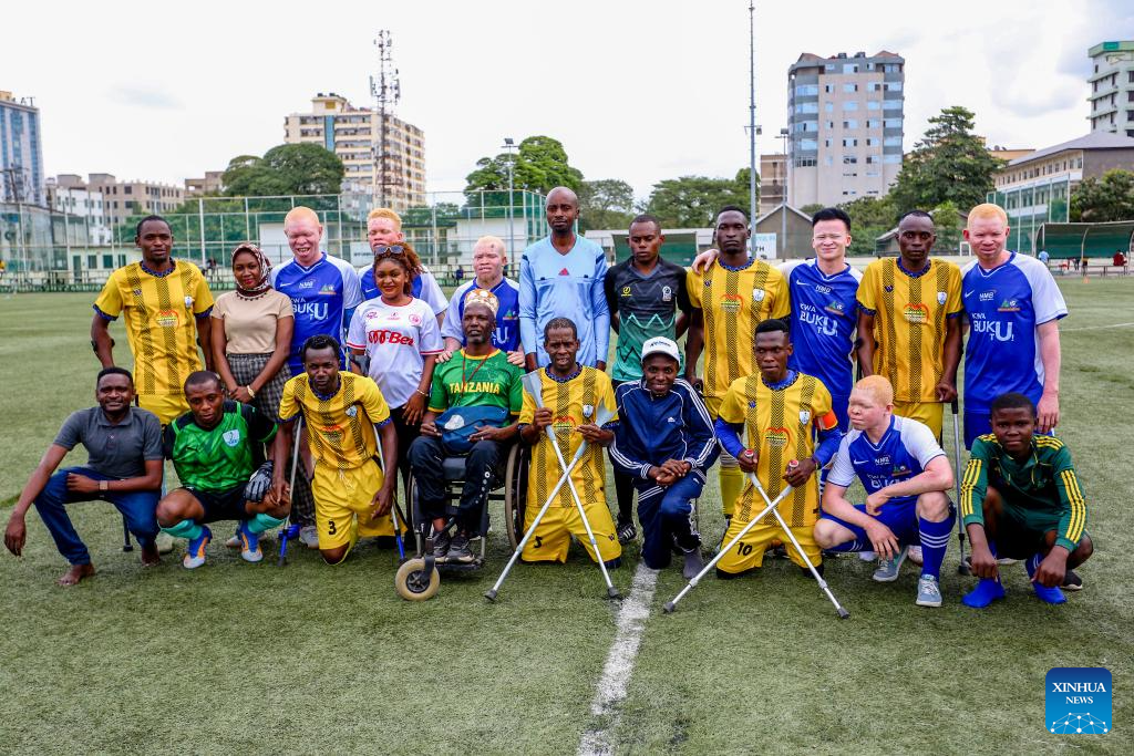 Players of Albinism Sports Club pose with players of Sauti Parasports Club before a friendly match at the Jakaya M. Kikwete Youth Park in Dar es Salaam, Tanzania, on July 20, 2024. (Photo by Emmanuel Herman/Xinhua)