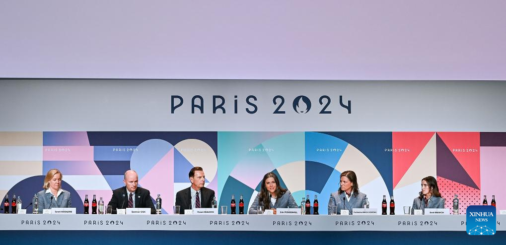 This photo taken on July 24, 2024 shows a press conference after Salt Lake City of the United States has been awarded as the host of the 2034 Winter Olympic Games in Paris, France. (Xinhua/Wu Huiwo)