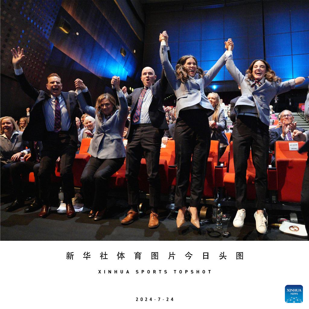 The delegation from Salt Lake City celebrate after winning the bid to host the 2034 Winter Games during the 142nd International Olympic Committee (IOC) session in Paris, France, July 24, 2024. Salt Lake City of the United States has been awarded as the host of the 2034 Winter Olympic Games at the 142nd IOC session here on Wednesday. (Xinhua/Sun Fei)