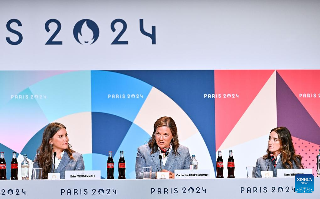 Catherine Raney-Norman (C), Chair of the Utah Committee for the Games and former speed skater, speaks at a press conference in Paris, France, July 24, 2024. Salt Lake City of the United States has been awarded as the host of the 2034 Winter Olympic Games at the 142nd International Olympic Committee session here on Wednesday. (Xinhua/Wu Huiwo)