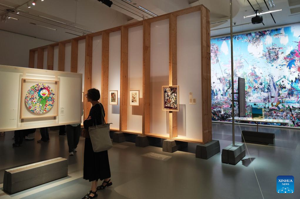 A visitor walks past artworks during an exhibition on the Japanese pop culture tradition at National Gallery of Art in Vilnius, Lithuania, on July 24, 2024. Titled Beauties, Ghosts, and Samurai--The Japanese Pop Culture Tradition from Edo Ukiyo-e to Manga, Anime, and Supa Furatto in the 20th and 21st Centuries, the exhibition is held here from July 19 to Oct. 13, presenting works of more than 70 artists. (Photo by Yang Weihua/Xinhua)