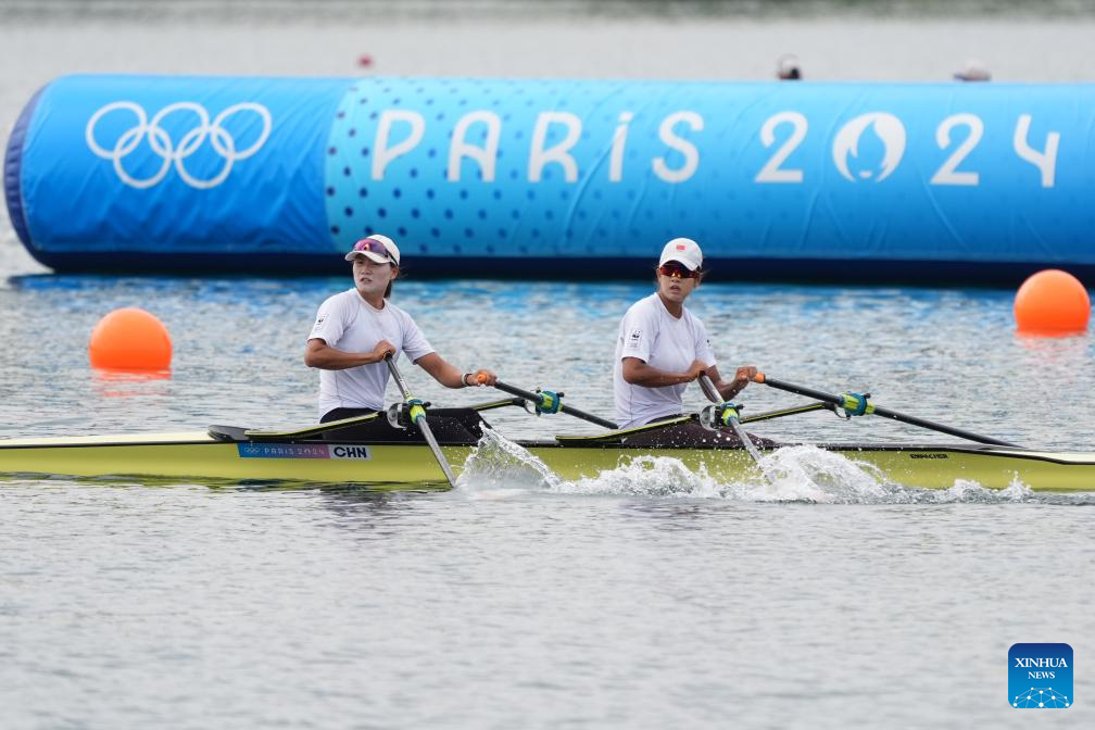 Lu Shiyu (R)/Shen Shuangmei of China's rowing team train ahead of the Paris 2024 Olympic Games in Vaires-sur-Marne, France, on July 25, 2024. (Xinhua/Shen Bohan)