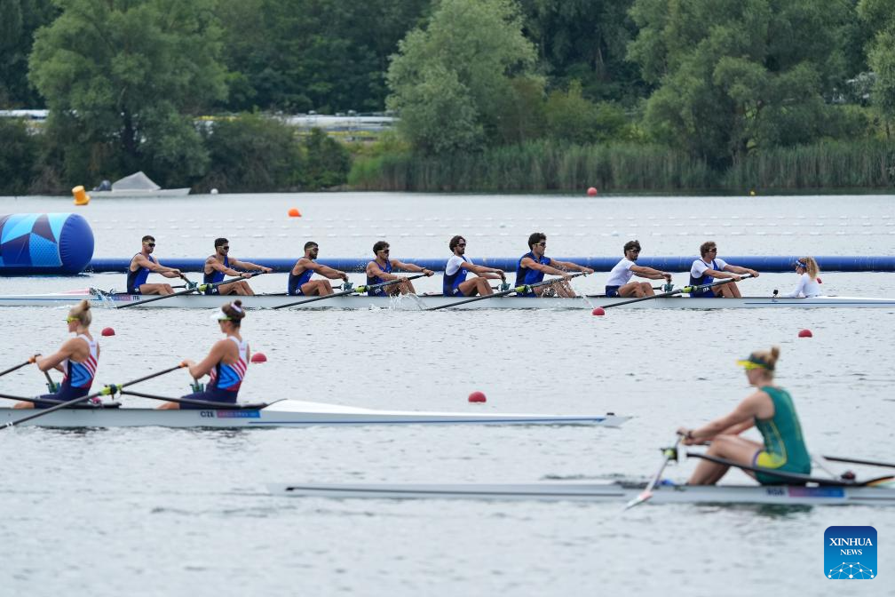 Members of Italy's rowing team (top) train ahead of the Paris 2024 Olympic Games in Vaires-sur-Marne, France, on July 25, 2024. (Xinhua/Shen Bohan)