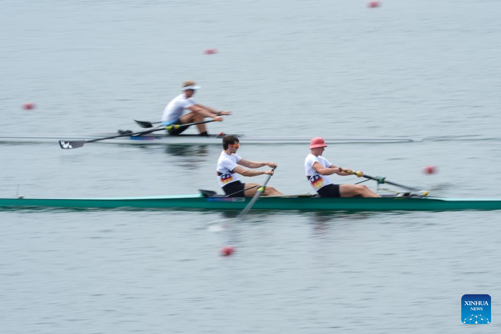 Members of Germany's rowing team (bottom) and a member of New Zealand's rowing team train ahead of the Paris 2024 Olympic Games in Vaires-sur-Marne, France, on July 25, 2024. (Xinhua/Shen Bohan)