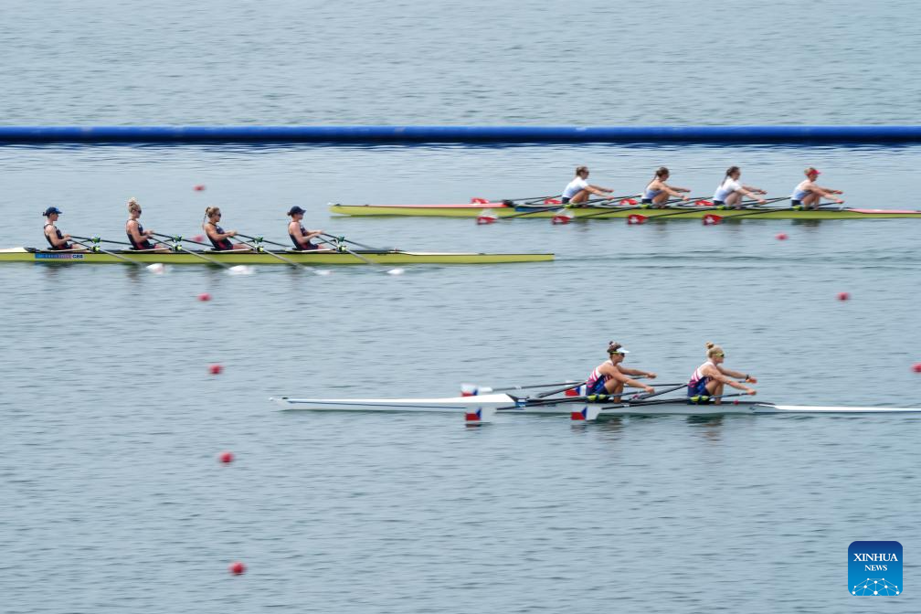Members of Switzerland's rowing team (top), members of Britain's rowing team (C) and members of Czech Republic's rowing team train ahead of the Paris 2024 Olympic Games in Vaires-sur-Marne, France, on July 25, 2024. (Xinhua/Shen Bohan)