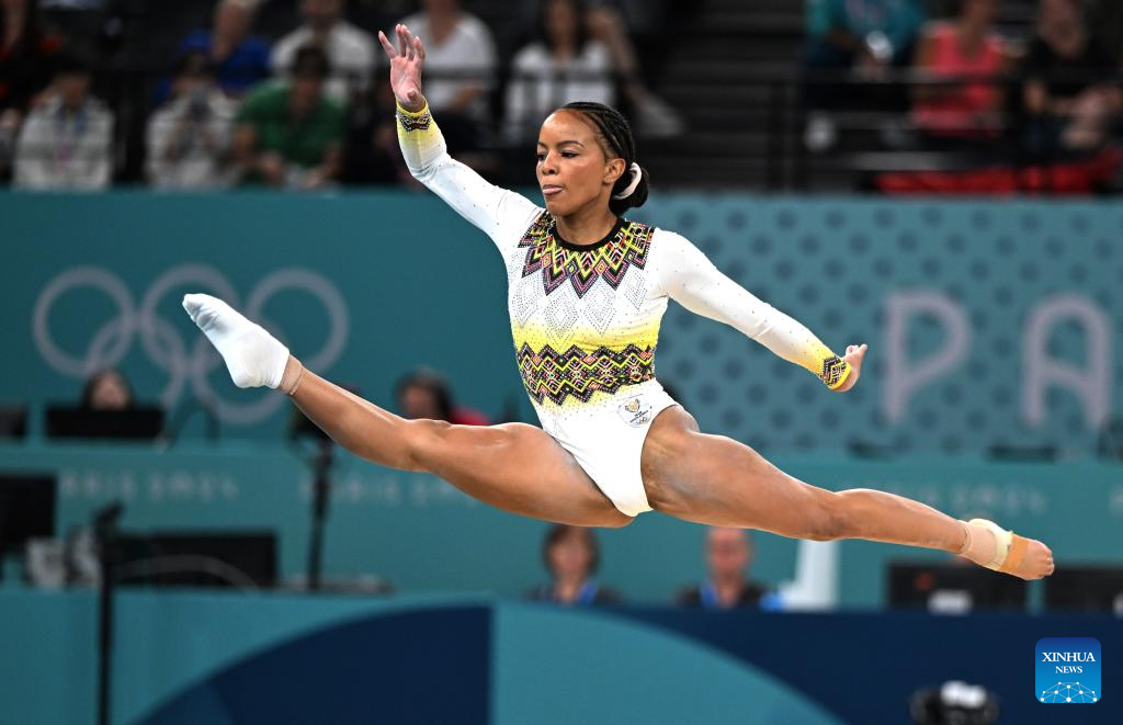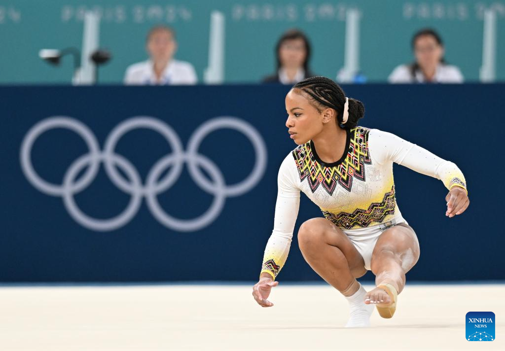 Caitlin Rooskrantz of South Africa competes in the floor exercise event of the artistic gymnastics women's qualification match during the Paris 2024 Olympic Games at Bercy Arena in Paris, France, July 28, 2024. (Xinhua/Cheng Min)