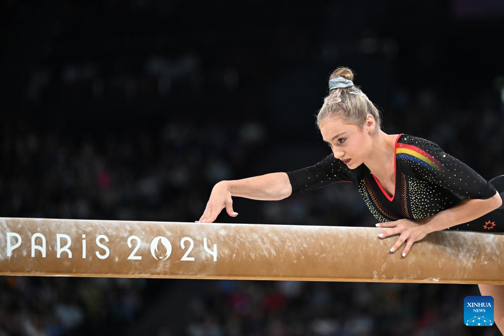 Sabrina Maneca-Voinea of Romania competes in the balance beam event of the artistic gymnastics women's qualification match during the Paris 2024 Olympic Games at Bercy Arena in Paris, France, July 28, 2024. (Xinhua/Cheng Min)