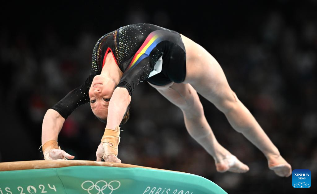 Ana Barbosu of Romania competes in the vault event of the artistic gymnastics women's qualification match during the Paris 2024 Olympic Games at Bercy Arena in Paris, France, July 28, 2024. (Xinhua/Cheng Min)