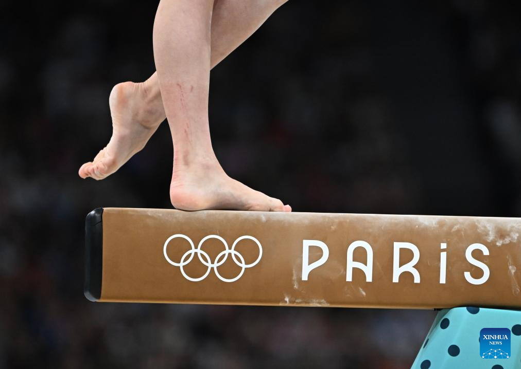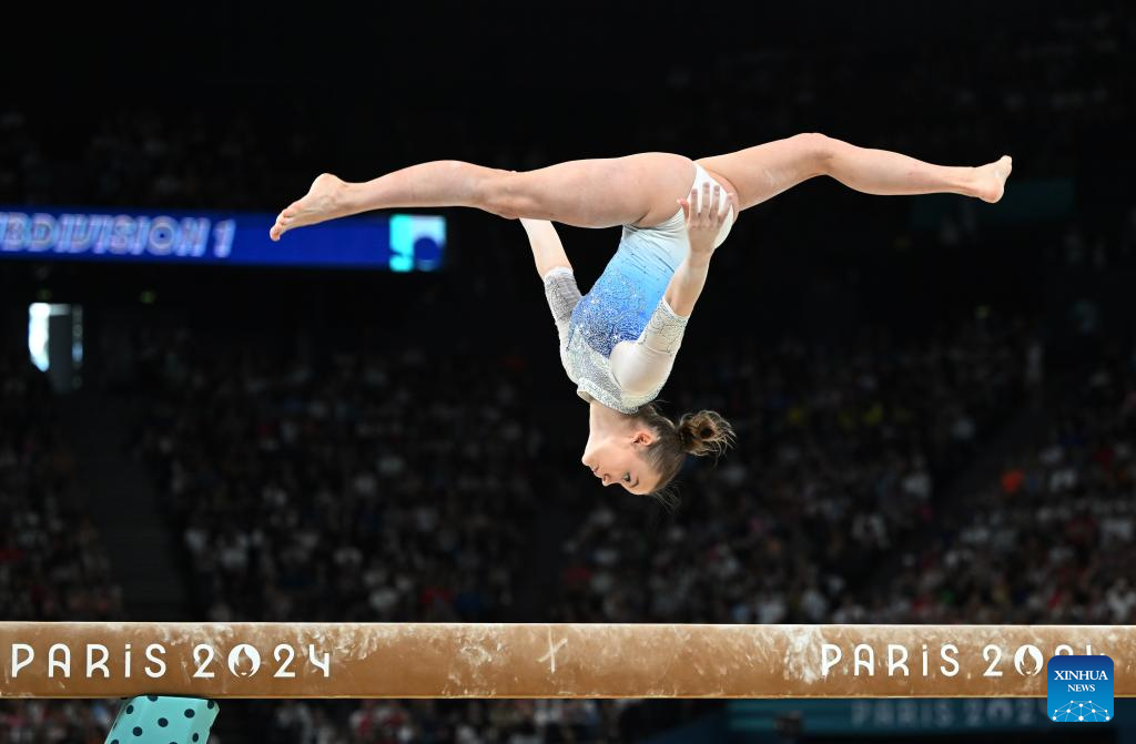 Anna Lashchevska of Ukraine competes in the balance beam event of the artistic gymnastics women's qualification match during the Paris 2024 Olympic Games at Bercy Arena in Paris, France, July 28, 2024. (Xinhua/Cheng Min)