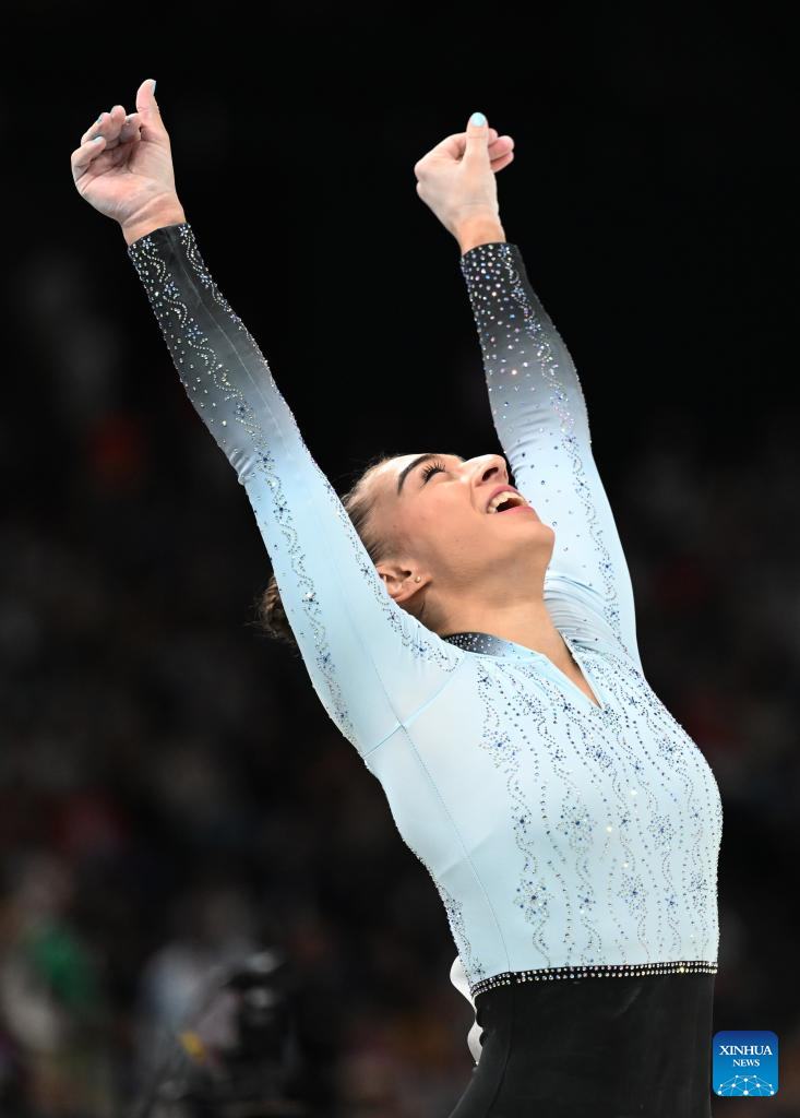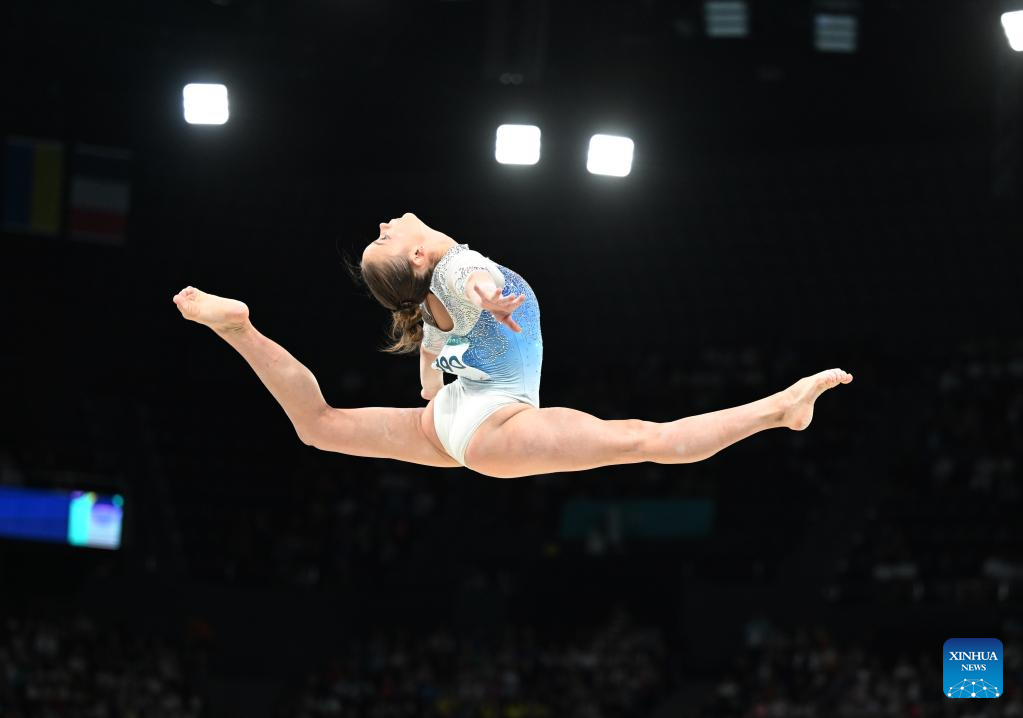 Anna Lashchevska of Ukraine competes during the artistic gymnastics women's qualification match during the Paris 2024 Olympic Games at Bercy Arena in Paris, France, July 28, 2024. (Xinhua/Cheng Min)