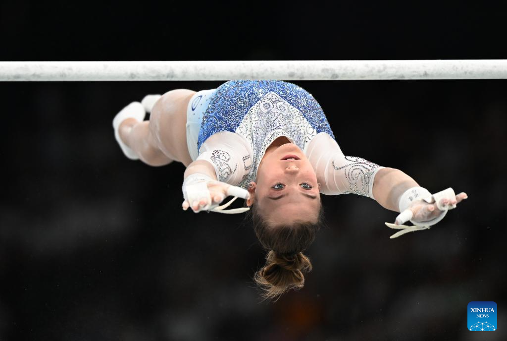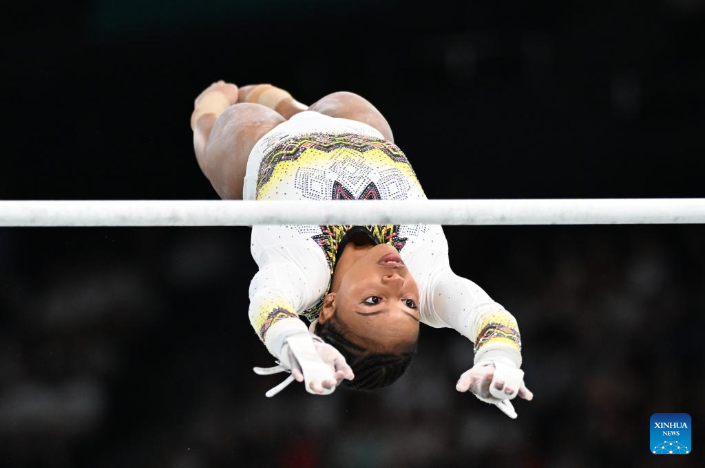 Caitlin Rooskrantz of South Africa competes in the uneven bars event of the artistic gymnastics women's qualification match during the Paris 2024 Olympic Games at Bercy Arena in Paris, France, July 28, 2024. (Xinhua/Cheng Min)