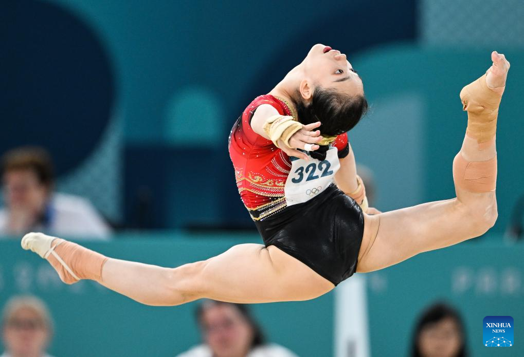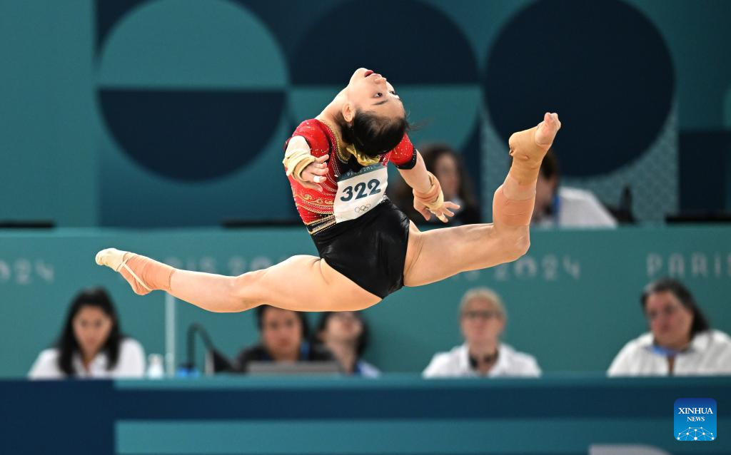 Ou Yushan of China competes in the floor exercise event of the artistic gymnastics women's qualification match during the Paris 2024 Olympic Games at Bercy Arena in Paris, France, July 28, 2024. (Xinhua/Liu Dawei)