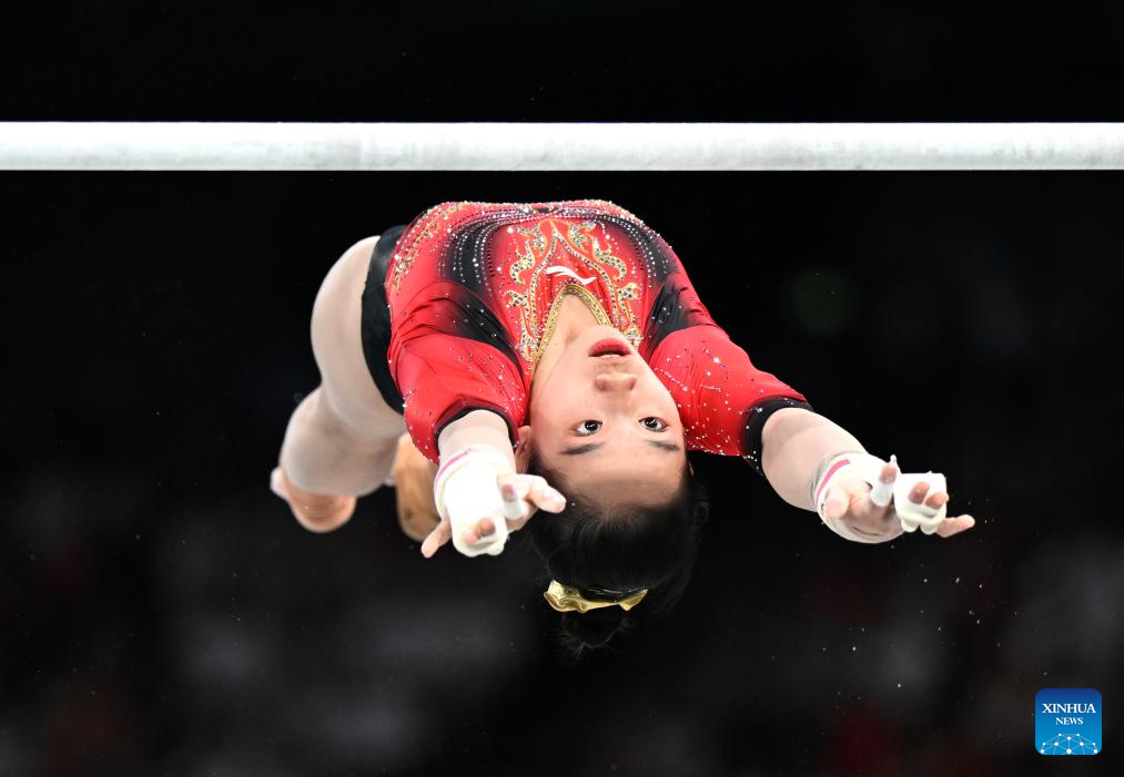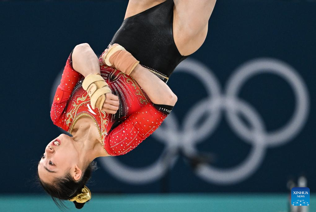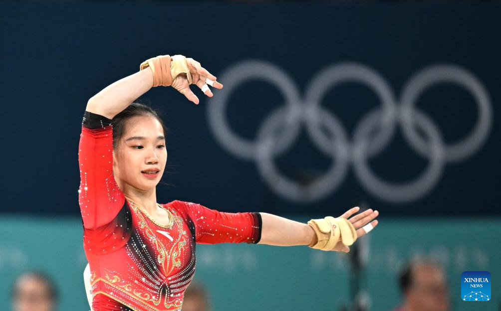 Ou Yushan of China competes in the uneven bars event of the artistic gymnastics women's qualification match during the Paris 2024 Olympic Games at Bercy Arena in Paris, France, July 28, 2024. (Xinhua/Cheng Min)
