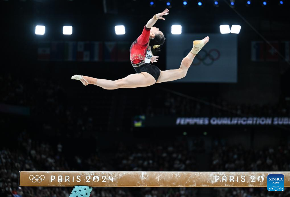 Ou Yushan of China competes in the balance beam event of the artistic gymnastics women's qualification match during the Paris 2024 Olympic Games at Bercy Arena in Paris, France, July 28, 2024. (Xinhua/Liu Dawei)