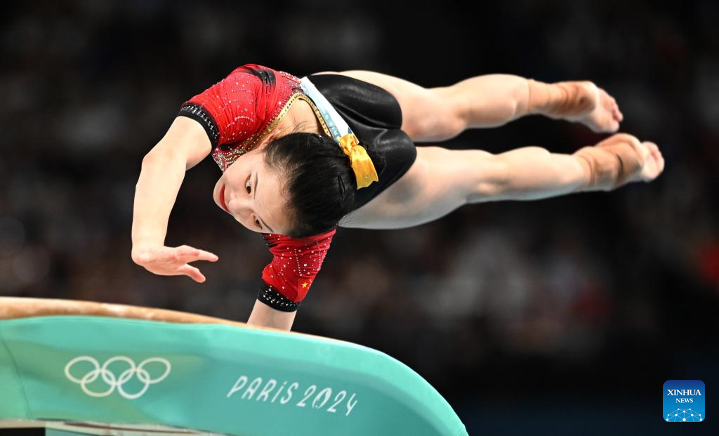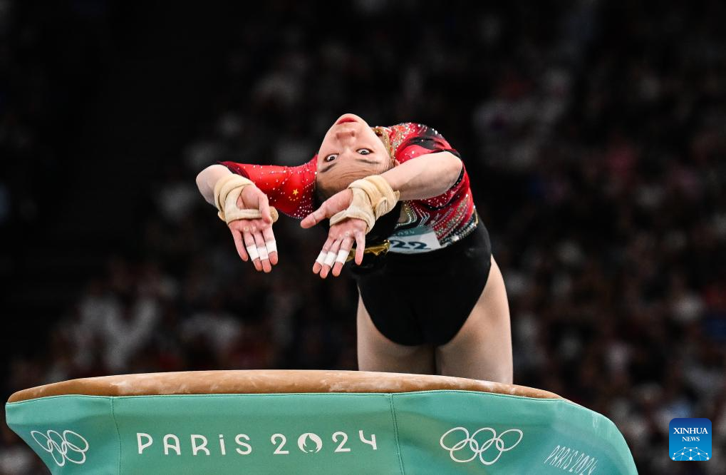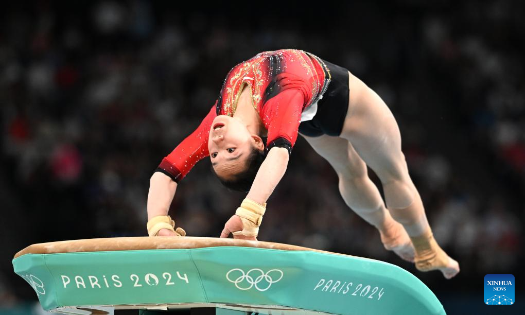 Ou Yushan of China competes in the vault event of the artistic gymnastics women's qualification match during the Paris 2024 Olympic Games at Bercy Arena in Paris, France, July 28, 2024. (Xinhua/Liu Dawei)