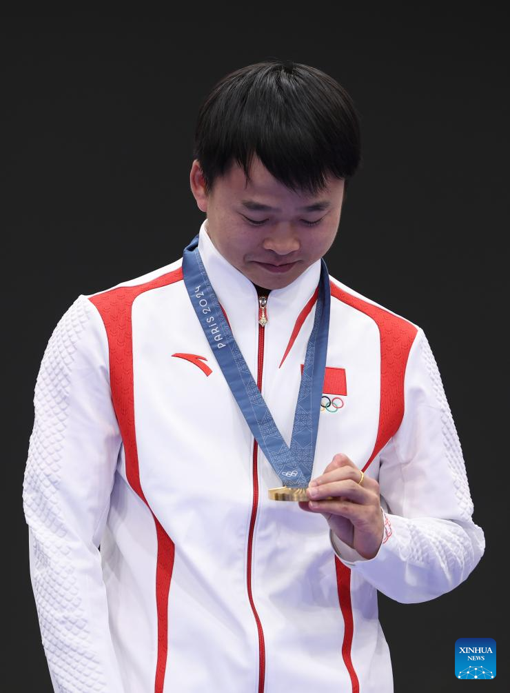 Gold medalist Xie Yu of China reacts during the awarding ceremony after the 10m air pistol men's final of shooting at the Paris 2024 Olympic Games in Chateauroux, France, on July 28, 2024. (Xinhua/Zhao Dingzhe)