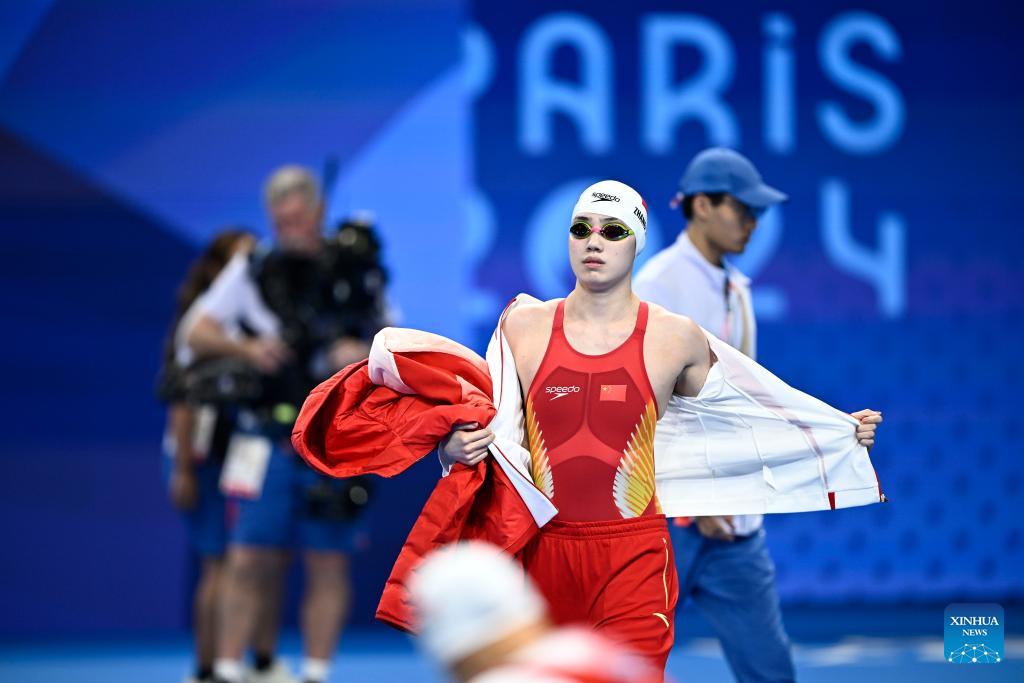 Zhang Yufei of China prepares before Women's 100m Butterfly Semifinal of Swimming at the Paris 2024 Olympic Games in Paris, France, on July 27, 2024. (Xinhua/Wang Peng)