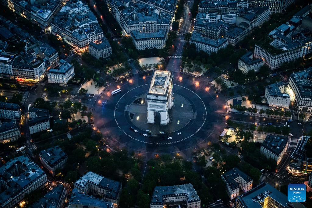 This photo taken from an helicopter on July 26, 2024 shows an aerial view of the Arc de Triomphe during the opening ceremony of the Paris 2024 Olympic Games in Paris, France. (Photo by Lionel Bonaventure/POOL/Xinhua)