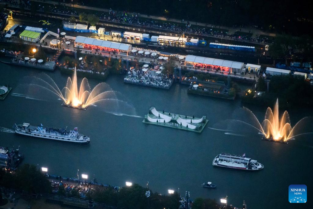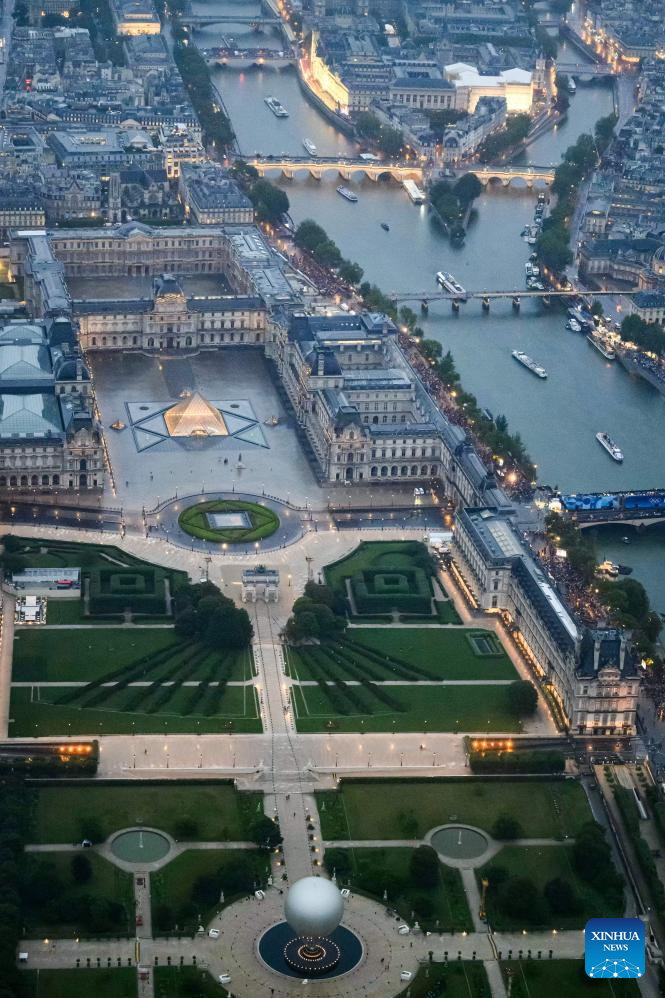 This photo taken from an helicopter on July 26, 2024 shows an aerial view of the Eiffel Tower (rear C) and the Grand Palais (front R) during the opening ceremony of the Paris 2024 Olympic Games in Paris, France. (Photo by Lionel Bonaventure/POOL/Xinhua)