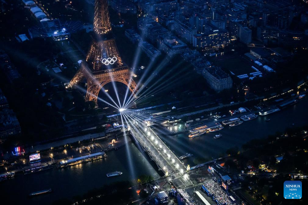 This photo taken from an helicopter on July 26, 2024 shows an aerial view of the Eiffel Tower and the Olympics Rings lightened up during the opening ceremony of the Paris 2024 Olympic Games in Paris, France. (Photo by Lionel Bonaventure/POOL/Xinhua)