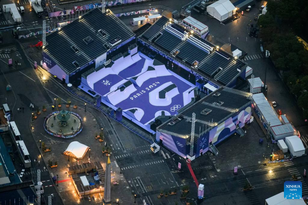 This photo taken from an helicopter on July 26, 2024 shows an aerial view of the Place de la Concorde with its Olympic venue during the opening ceremony of the Paris 2024 Olympic Games in Paris, France. (Photo by Lionel Bonaventure/POOL/Xinhua)