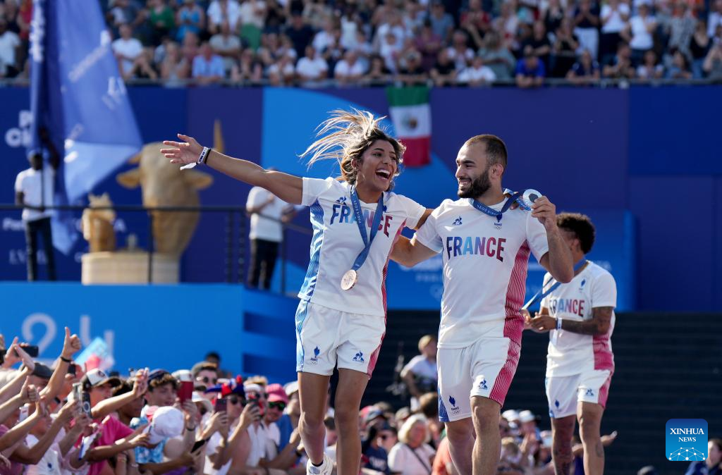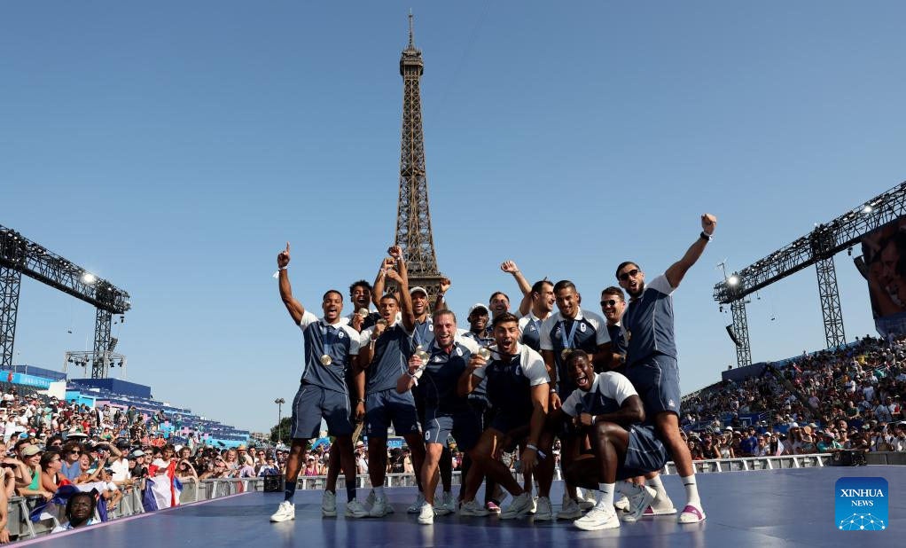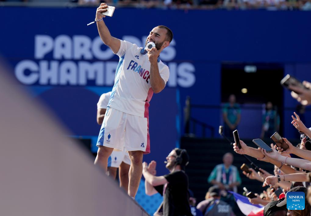Medalists of France pose for photos at Champions Park for the Paris 2024 Olympic Games in Paris, France, July 29, 2024. (Xinhua/Li Ying)