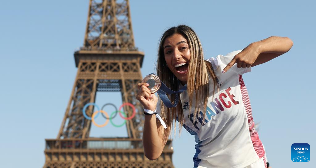 France's judo athlete Shrine Boukli poses with the Effiel Tower at Champions Park for the Paris 2024 Olympic Games in Paris, France, July 29, 2024. (Xinhua/Li Ying)