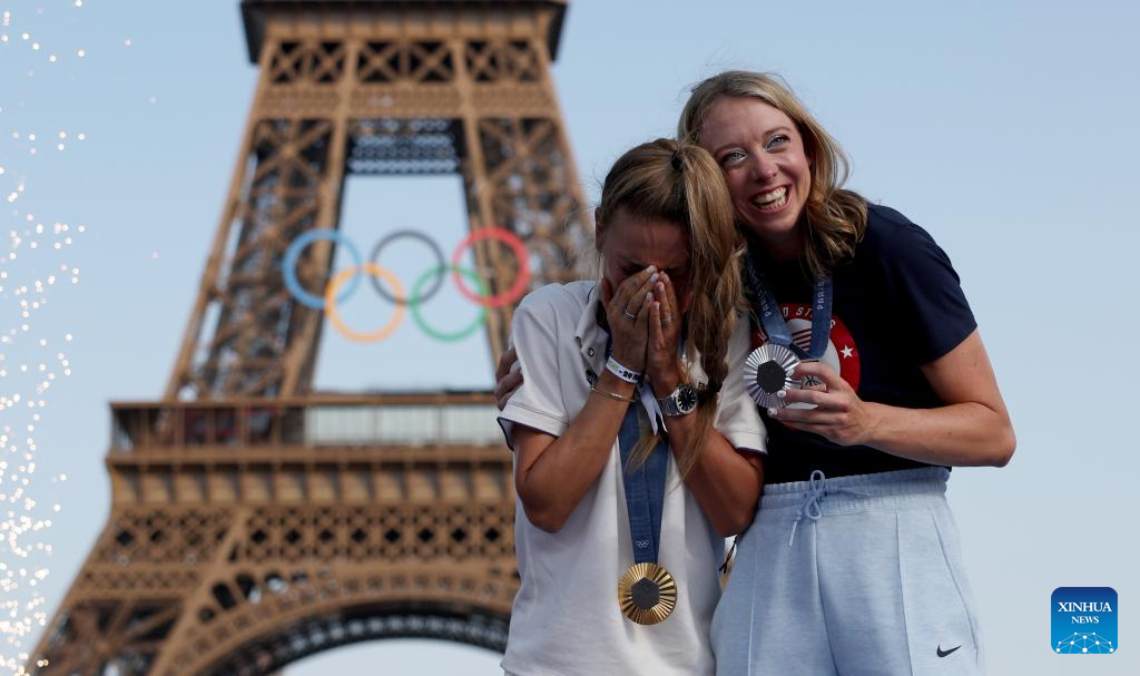 Mountain Bike women's cross-country silver medalist Haley Batten of United States and gold medalist Pauline Ferrand Prevot (L) of France celebrate at Champions Park for the Paris 2024 Olympic Games in Paris, France, July 29, 2024. (Xinhua/Li Ying)