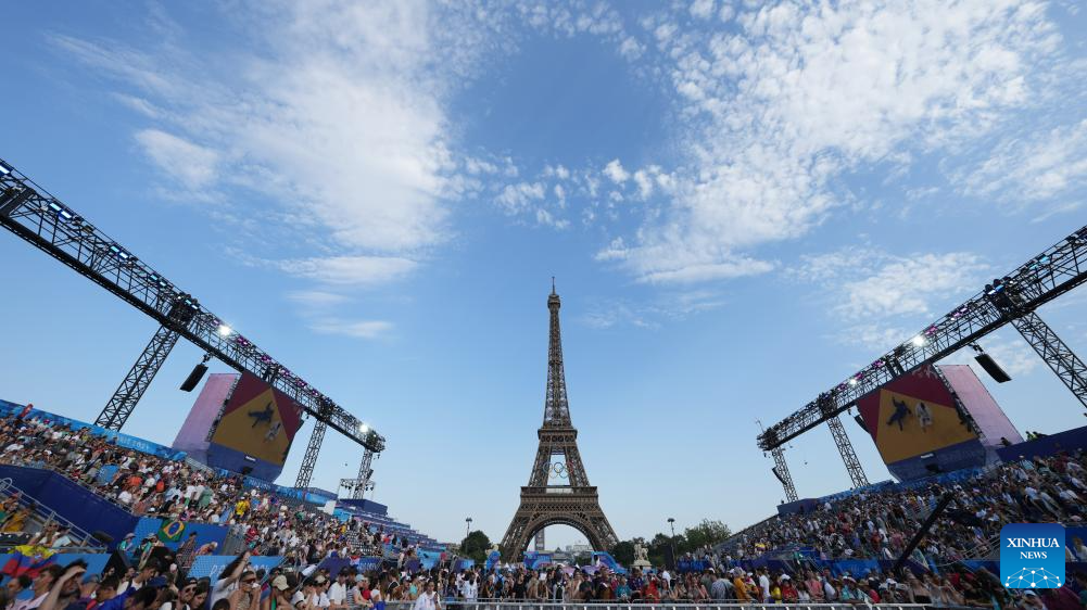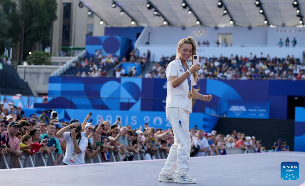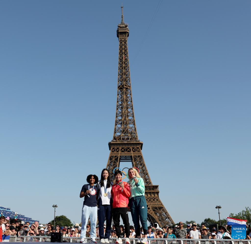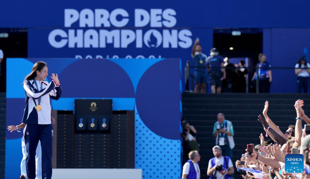 People interact with medalists at Trocadero Champions Park for the Paris 2024 Olympic Games in Paris, France, July 29, 2024. (Xinhua/Li Ying)