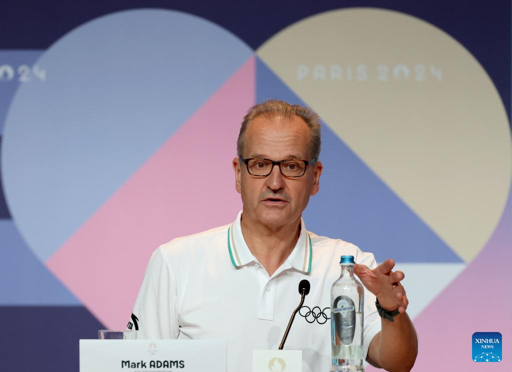 Mark Adams, IOC spokesperson, attends a daily IOC-Paris 2024 joint press briefing, which World Triathlon representatives attend for the postponement of men's triathlon, at the Main Press Centre during the Paris 2024 Olympic Games in Paris, France, on July 30, 2024. The Men's Triathlon, originally scheduled to take place at 08:00 on Tuesday, has been postponed and will take place at 10:45 on Wednesday, after the Women's Triathlon competition. (Xinhua/Li Ming)