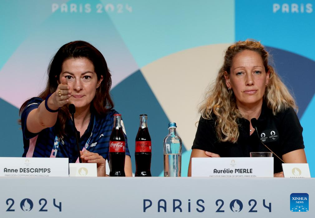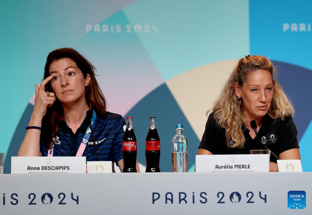 Anne Descamps, Paris 2024 Executive Director of Communications, and Aurelie Merle, Paris 2024 Executive Director of Sports, attend a daily IOC-Paris 2024 joint press briefing, which World Triathlon representatives attend for the postponement of men's triathlon, at the Main Press Centre during the Paris 2024 Olympic Games in Paris, France, on July 30, 2024. The Men's Triathlon, originally scheduled to take place at 08:00 on Tuesday, has been postponed and will take place at 10:45 on Wednesday, after the Women's Triathlon competition. (Xinhua/Li Ming)